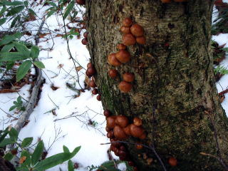 ナラ枯れに遭った、まだ若いナラの立木にナメコ