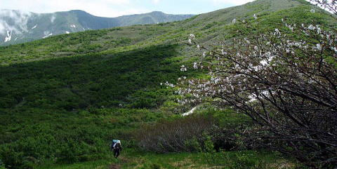 きつい二ノ坂を登り切り、すっかり融けてしまった大雪渓への道を下ったあたりで、薄っすらと