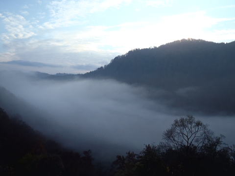 朝霧が眼下の山肌を包むようにゆっくり流れていた。