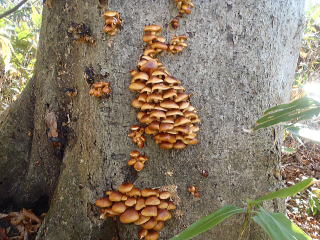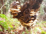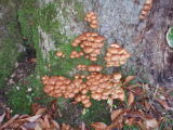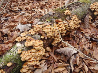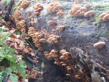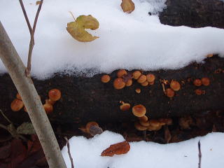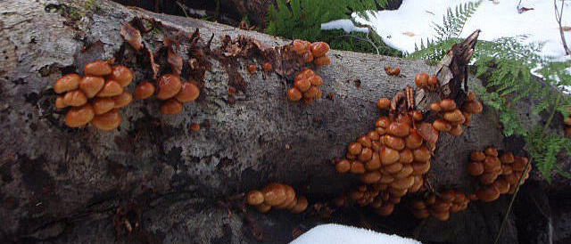 ナメコ発生、盛りになっているブナの倒木・・・じきに空いているか所に、どんどん生えてくるだろう