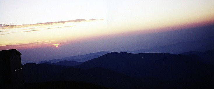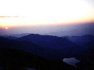夕焼け染まる以東岳の山頂に立ち、陽が落ちるまで見続けた