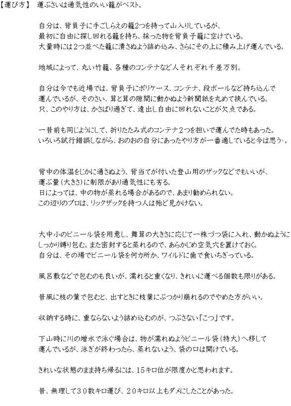 携帯備品・・・背負い籠、ナタ、雨具、軍手、
