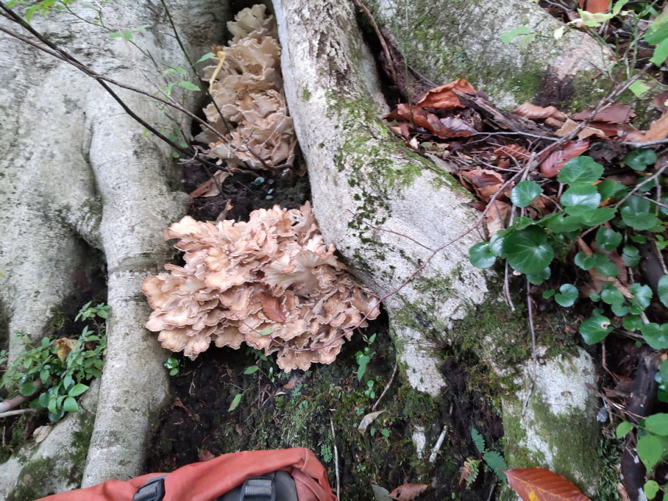 そのナラの根が地中を這って、このブナの木に絡み、舞茸が生え出ていました。